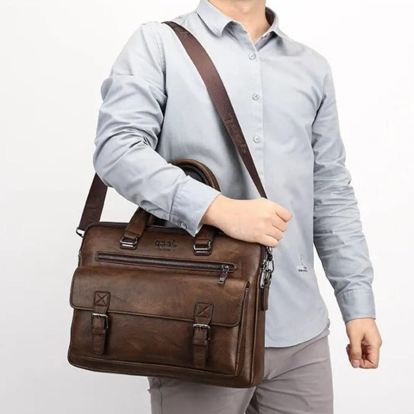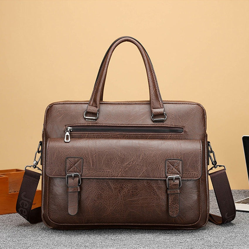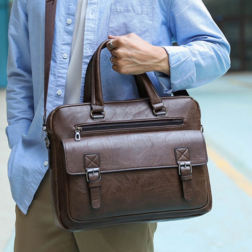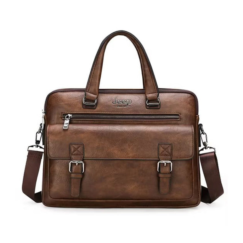 The front of the bag is designed for organized access, showcasing a large flap pocket secured by two decorative buckle straps (likely with magnetic snaps underneath for quick entry). Above this, a convenient horizontal zippered pocket offers additional secure storage. All visible hardware, including zippers, strap clips, and buckles, is rendered in a gleaming silver-tone metal, providing a sharp contrast against the deep brown material. Its structured form suggests capacity for a laptop and documents, making it a practical and stylish choice for business, travel, or daily professional useThe front of the bag is designed for organized access, showcasing a large flap pocket secured by two decorative buckle straps (likely with magnetic snaps underneath for quick entry). Above this, a convenient horizontal zippered pocket offers additional secure storage. All visible hardware, including zippers, strap clips, and buckles, is rendered in a gleaming silver-tone metal, providing a sharp contrast against the deep brown material. Its structured form suggests capacity for a laptop and documents, making it a practical and stylish choice for business, travel, or daily professional use